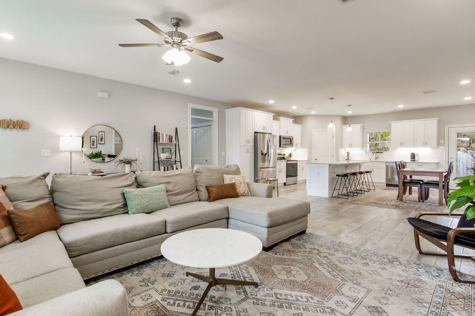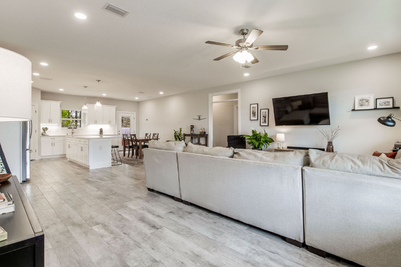 The kitchen is a true centerpiece, featuring sleek quartz countertops, custom cabinetry, stainless steel appliances, under cabinet lighting, and a large island that flows seamlessly into the main living space. Durable tile plank flooring runs throughout the main areas and wet spaces, offering both style and low maintenance.