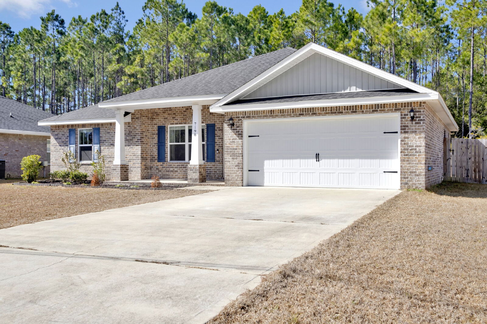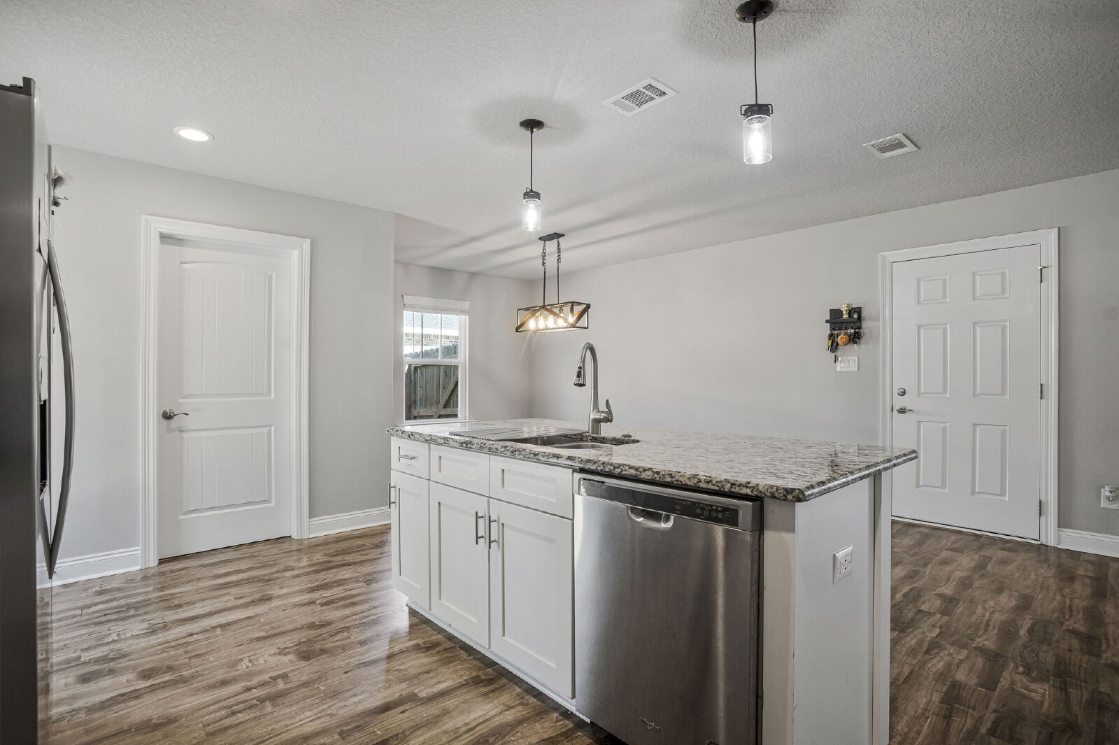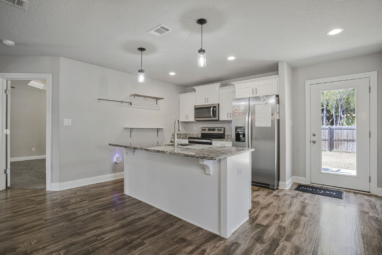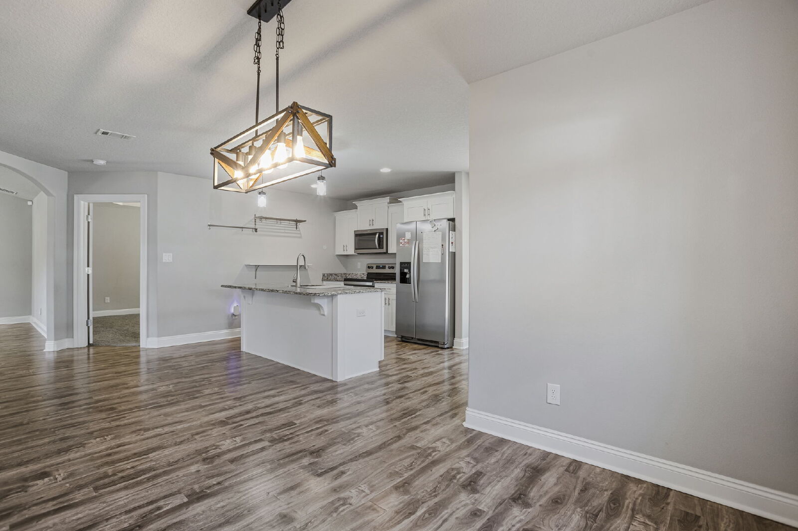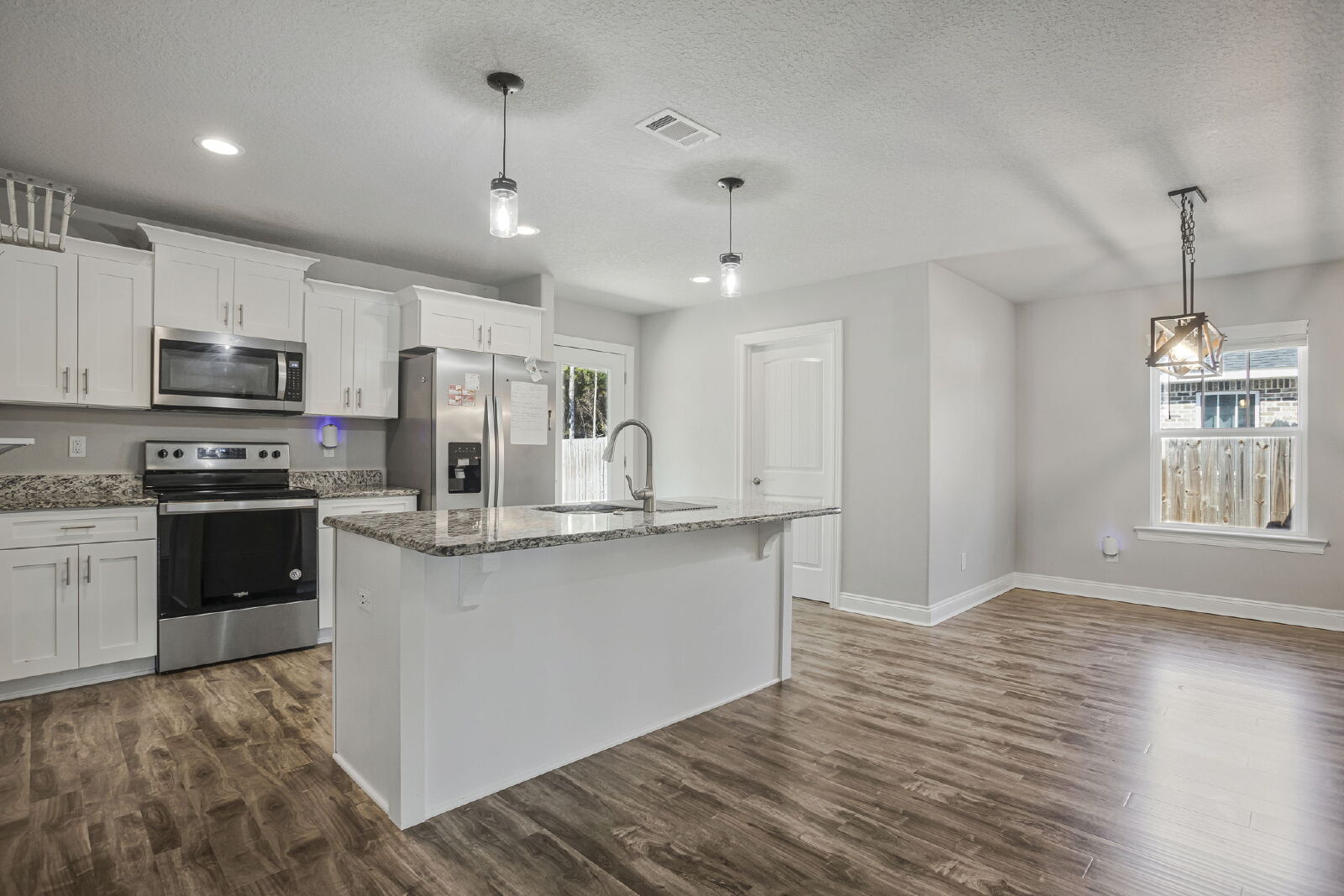 Welcome home! This like-new rental offers a smart split floor plan, vaulted ceilings, and durable gray luxury vinyl plank flooring that’s both scratch and water resistant, perfect for everyday living. Brushed nickel fixtures and hardware throughout give the home a clean, modern feel.The kitchen really shines with white shaker cabinets (soft-close doors and drawers), granite countertops, undermount sinks, brushed nickel faucet, and a full stainless steel appliance package including stove, microwave, and dishwasher.The primary suite is spacious and comfortable with a trey ceiling and plush carpet. The ensuite bathroom features a double vanity with granite countertops, undermount sinks, tiled flooring, a garden tub, tiled surround shower, walk-in closet, and matching brushed nickel finishes.Washer and dryer are included for your convenience. Step outside to enjoy the large fenced yard, ideal for relaxing, entertaining, or letting your dog roam. Bonus, No HOA.